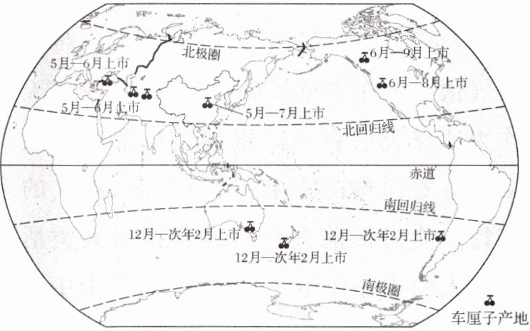 材料二 下图为车厘子主要产地及上市时间分布图。
