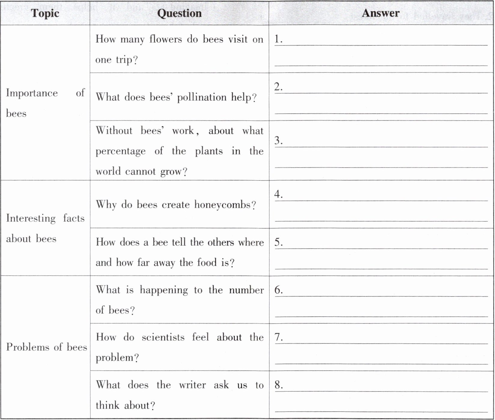 | Problems of bees | What is happening to the number of bees? | 6. ______ |