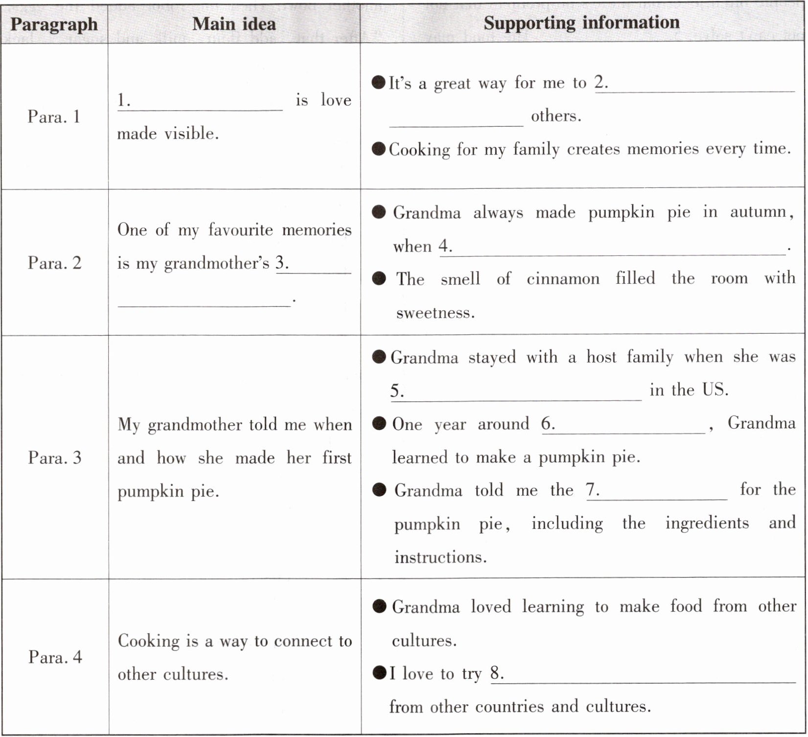 | Para. 2 | One of my favourite memories is my grandmother's 3. ____ ____. | ● Grandma always made pumpkin pie in autumn, when 4. ____ ____ ____ ____.