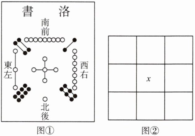 2. 洛书(如图①),古称龟书,现已入选国家级非物质文化遗产名录.洛书是术数中乘法的起源,“戴九履一,左三右七,二四为肩,六八为足,五居中宫”是对洛书形象的描述,洛书对应的九宫格(如图②)填有1到9这九个正整数,满足任意一行、列、对角线上三个数之和相等.洛书的填法古人是怎么找到的呢?在学习了方程相关知识后,小凯尝试探究其中的奥秘.