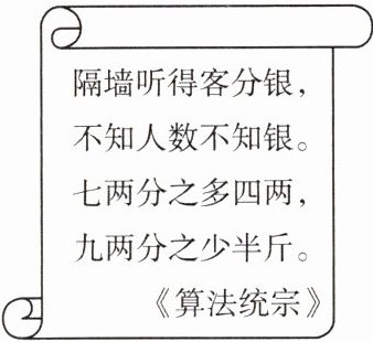 1. 下图是明代数学家程大位的《算法统宗》中的一个问题,其大意为:有一群人分银子,如果每人分七两,则剩余四两;如果每人分九两,则还差八两(注:明代时1斤= 16两,故有“半斤八两”这个成语,设未知数列方程正确顺序的序号是______.