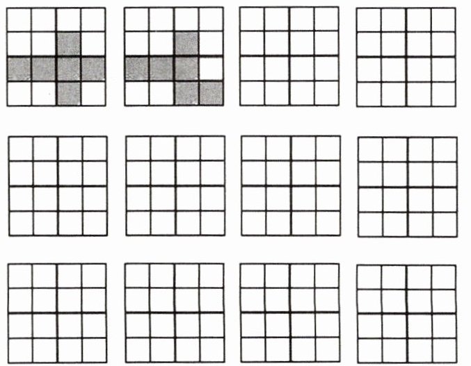 第一行第三列、第二行第一列、第二行第二列、第二行第三列、第三行第二列、第四行第三列小正方形涂黑。