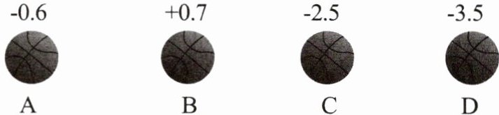 3. 如图,检测篮球.篮球质量超过标准质量的克数记为正数,不足的克数记为负数.下面是检测过的 $4$ 个篮球,在其上方标注了检测结果,其中质量最接近标准质量的一个是(