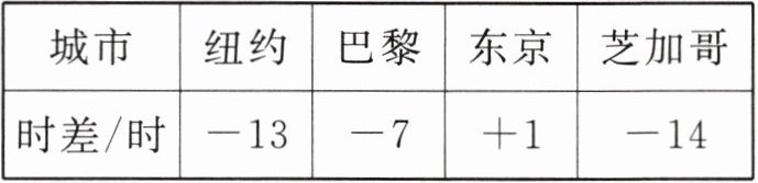9. 下表列出了国外几个城市与北京的时差(带正号的表示同一时刻比北京时间晚的小时数,带负号的表示同一时刻比北京时间早的小时数).如北京时间的上午$10$时,东京时间的$10时已过去了1$小时,现在已是$10+1= 11$(时).