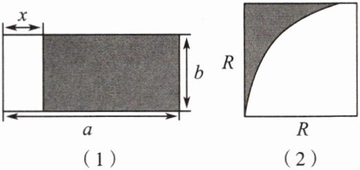 (2)阴影部分为正方形面积减去扇形面积,正方形面积为$R^2$,扇形面积为$\frac{1}{4}\pi R^2$,面积为$R^2 - \frac{1}{4}\pi R^2$。