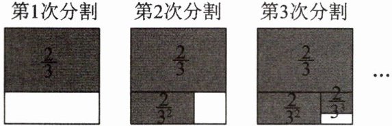 第3次分割,把上次分割图中空白部分的面积继续三等分,阴影部分的面积之和为$\frac{2}{3} + \frac{2}{3^{2}} + \frac{2}{3^{3}}$;