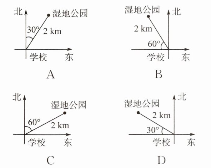 5.湿地公园位于学校北偏西$30^{\circ }$方向2km处,下列选项中表示正确的是 (