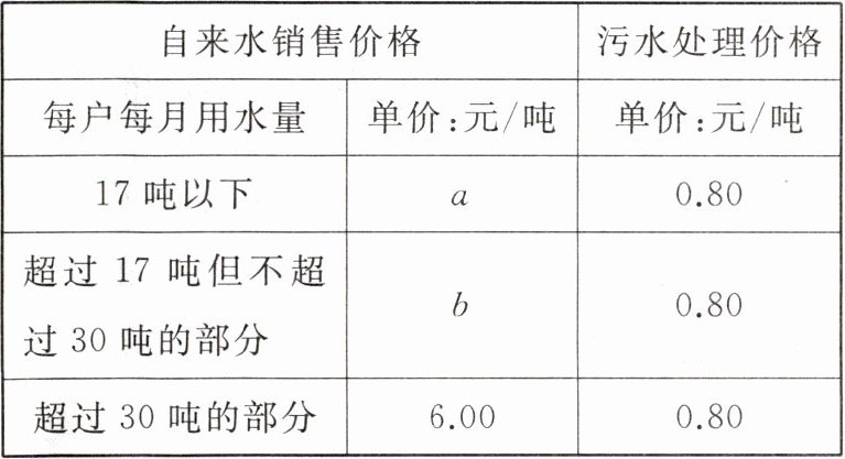 自来水销售价格污水处理价格每户每月用水量单价:元/吨单价:元/吨17吨以下a0.80超过17吨但不超过30吨的部分b0.80超过30吨的部分6.000.80