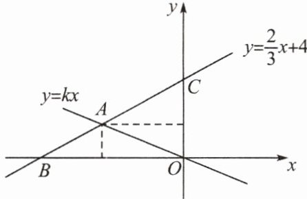 18. 如图,直线$y = kx(k\neq0)与y = \frac{2}{3}x + 4在第二象限交于点A$,$y = \frac{2}{3}x + 4交x$轴、$y轴分别于B$,$C$两点。$S_{\triangle ABO}:S_{\triangle ACO} = 1:2$,则方程组$\begin{cases}kx - y = 0,\\2x - 3y + 12 = 0\end{cases} $的解为