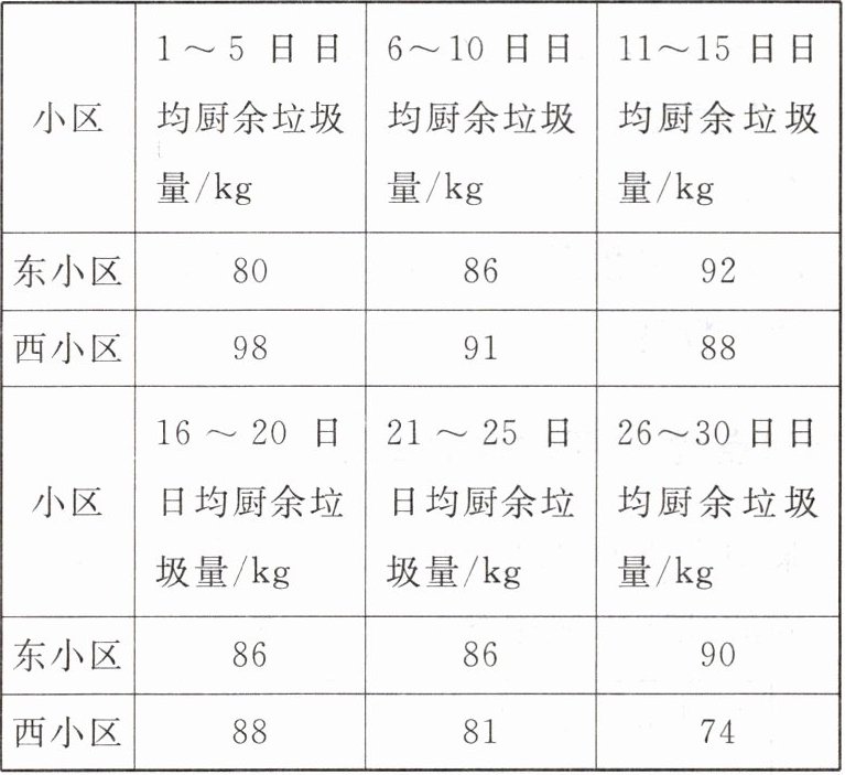 (1)东小区4月各时间段日均厨余垃圾量分别为80kg(5天)、86kg(5天)、92kg(5天)、86kg(5天)、86kg(5天)、90kg(5天)。