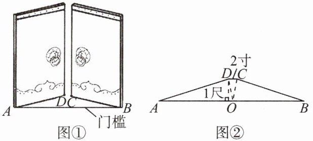 14. 《九章算术》中记载:今有开门去阃(读kǔn,门槛的意思)一尺,不合二寸,问门广几何?题目大意是:如图①②(图②为图①的平面示意图),推开双门,双门间隙CD的距离为2寸,点C和点D距离门槛AB都为1尺(1尺= 10寸),则AB的长是 (