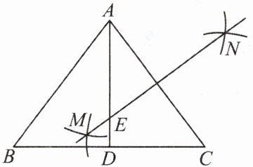 17. 如图,在△ABC中,AB= AC= 5,BC= 6,AD平分∠BAC交BC于点D,分别以点A和点C为圆心,大于$ \dfrac{1}{2}AC $的长为半径作弧,两弧相交于点M和点N,作直线MN,交AD于点E,则DE的长为