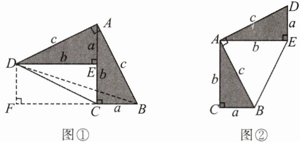 将两个全等的直角三角形按图①摆放,其中∠DAB = 90°.求证:a^2 + b^2 = c^2.