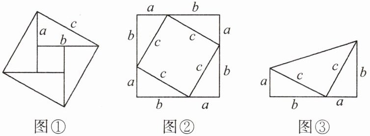 ②选择图②证明:大正方形边长为$a + b$,面积$=(a + b)^{2}$。大正方形由4个直角三角形和1个小正方形组成,4个三角形面积$=4×\frac{1}{2}ab = 2ab$,小正方形面积$=c^{2}$。则$(a + b)^{2}=2ab + c^{2}$,展开得$a^{2}+2ab + b^{2}=2ab + c^{2}$,化简得$a^{2}+b^{2}=c^{2}$。