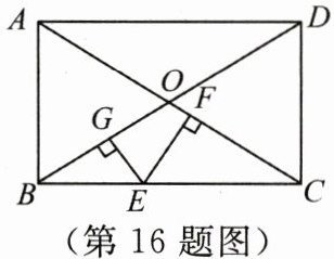 16. (2023·四川内江中考)出入相补原理是我国古代数学的重要成就之一,最早是由三国时期数学家刘徽创建. “将一个几何图形,任意切成多块小图形,几何图形的总面积保持不变,且等于所分割成的小图形的面积之和”是出入相补原理的重要内容之一. 如图,在矩形 ABCD 中,AB = 5,AD = 12,对角线 AC 与 BD 交于点 O,点 E 为 BC 边上的一个动点,EF⊥AC,EG⊥BD,垂足分别为点 F,G,则 EF + EG =