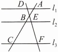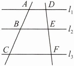 2. (2022·泉州模拟)如图,直线 $ l_1 // l_2 // l_3 $,直线 $ AC $ 分别交 $ l_1 $,$ l_2 $,$ l_3 $ 于点 $ A $,$ B $,$ C $,直线 $ DF $ 分别交 $ l_1 $,$ l_2 $,$ l_3 $ 于点 $ D $,$ E $,$ F $,$ AB = 3 $,$ BC = 5 $,$ DE = 2 $,则 $ EF = $