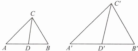 (2) 不相似。理由:设$\frac{AD}{AB}=\frac{A'D'}{A'B'}=k$,仅由$\frac{CD}{C'D'}=\frac{AC}{A'C'}=\frac{BC}{B'C'}$及$D$、$D'$位置关系,无法得出$\triangle ABC$与$\triangle A'B'C'$对应角相等或三边对应成比例,可构造反例(如一个为锐角三角形,一个为钝角三角形)说明不相似,故$\triangle ABC$与$\triangle A'B'C'$不相似。