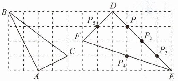 9. 如图,在边长为1的小正方形组成的网格中,$\triangle ABC$ 和 $\triangle DEF$ 的顶点都在格点上,$P_1,P_2,P_3,P_4,P_5$ 是 $\triangle DEF$ 边上的5个格点,请按要求完成下列各题: