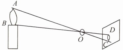 3. 如图,火焰的光线穿过小孔 $ O $,在竖直的屏幕上形成倒立的实像,像的高度为 $ 1.5\ cm $, $ OA = 48\ cm $, $ OC = 16\ cm $,则火焰的高度是