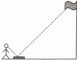 4. 如图,小明在地面上放了一个平面镜,选择合适的位置,刚好在平面镜中看到旗杆的顶部,此时小明与平面镜的水平距离为 $ 2\ m $,旗杆底部与平面镜的水平距离为 $ 16\ m $。若小明的眼睛与地面距离为 $ 1.5\ m $,则旗杆的高度为 (