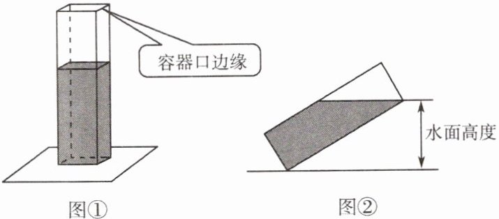 2. 如图①,长、宽均为 $ 3 $,高为 $ 8 $ 的长方体容器,放置在水平桌面上,里面盛有水,水面高为 $ 6 $。绕底面一棱进行旋转倾斜后,水面恰好触到容器口边缘,图②是此时的示意图,求图②中水面的高度。