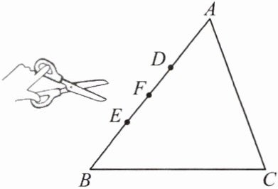 1. 下图为三角形纸片$ABC$,其中点$D和点E将AB$分成三等分,点$F为DE$的中点. 若小慕从$AB上的一点P$,沿着与直线$BC$平行的方向将纸片剪开后,剪下的小三角形纸片面积为$\triangle ABC的\frac{1}{3}$,则下列关于点$P$位置的叙述正确的是(