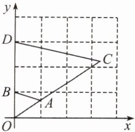 2. (2023·重庆中考)如图,在平面直角坐标系中,将 $ \triangle OAB $ 以原点 $ O $ 为位似中心放大后得到 $ \triangle OCD $。若 $ B(0,1) $,$ D(0,3) $,则 $ \triangle OAB $ 与 $ \triangle OCD $ 的相似比是(