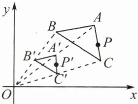 1. 如图,点 $ P(8,6) $ 在 $ \triangle ABC $ 的边 $ AC $ 上,以原点 $ O $ 为位似中心,在第一象限内将 $ \triangle ABC $ 缩小到原来的 $ \frac{1}{2} $,得到 $ \triangle A'B'C' $,点 $ P $ 在 $ A'C' $ 上的对应点 $ P' $ 的坐标为(