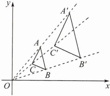 10. 如图,在平面直角坐标系中,$ \triangle ABC $ 和 $ \triangle A'B'C' $ 是以坐标原点 $ O $ 为位似中心的位似图形,且点 $ B(3,1) $,$ B'(6,2) $。