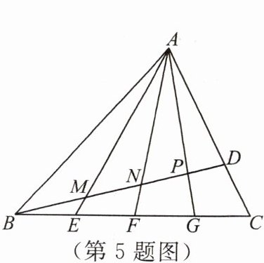 5. 如图,已知在$\triangle ABC$中,$D为AC$边上一点,$CD= \frac{1}{3}AC$,点$E,F,G四等分边BC$,连接$AE,AF,AG$,分别与$BD交于点M,N,P$,则$BM:BD= $
