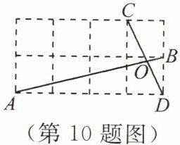 10. 如图,由边长为$1$的小正方形组成的网格中,点$A,B,C,D$为格点(即小正方形的顶点),$AB与CD相交于点O$,则$AO$的长为______。