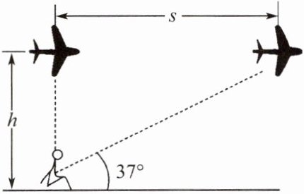 6. 一架飞机在空中水平匀速飞行,小冰同学站在水平地面上,听到该飞机的声音从头顶正上方传来,他发现飞机在他前上方与地面成 $ 37° $ 角的方向,如下图所示。已知飞机的飞行高度 $ h = 2052\ m $,假设飞机从头顶正上方到达他前上方与地面成 $ 37° $ 角的位置用时 $ 6\ s $,求飞机的速度以及声音在空气中的传播速度。(直角三角形一个角为 $ 37° $ 时,三个边的长度之比为 $ 3:4:5 $,结果均保留整数)