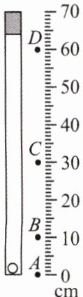 5. 右图是用照相机所拍摄的气泡从充满油的玻璃管底端向上运动的一张频闪照片,气泡从点 $ A $ 开始运动,频闪点 $ B $、$ C $、$ D $ 是每隔 $ 2\ s $ 拍摄的气泡位置。分析照片信息,回答下面的问题。