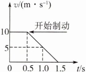 C 解析:由题图可知,汽车刹车前的速度为10m/s,由v=s/t可知,在0.5s的反应时间内车子前进的距离s反=vt反=10m/s×0.5s=5m,故A错误;从题图可知,0.5s开始踩刹车,1.5s停止,则从开始刹车到停止,所用的时间为t'=1.5s-0.5s=1s,故B错误;由题图可知,从开始踩刹车时车之后0.5s,车的速度为5m/s,故C正确;开始踩刹车时车的速度为10m/s,刹车后速度变小,平均速度一定小于10m/s,故D错误。