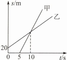 B.两车出发前相距 $ 20 \, m $, 甲比乙晚出发 $ 5 \, s $