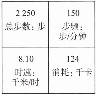 15 2.025 0.9 解析:根据图示中表格的信息可知,小明总步数为2250步,步频为150步/min,平均速度为8.10 km/h;则他本次跑步时间t案(二)$=\frac {2250步}{150步/min}=15min$,通过的路程$s=vt$$=8.1km/h×15×\frac {1}{60}h=2.025km$,他每跑一步的平均长度$s'=\frac {2.025×1000}{2250}m=0.9m$。