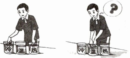 1. 如下图所示,把两只手分别放入热水和冷水中,然后,先把左手放入温水中,感受温水的冷热程度;再把右手放入温水中,感受温水的冷热程度。两只手对温水冷热程度的感觉是