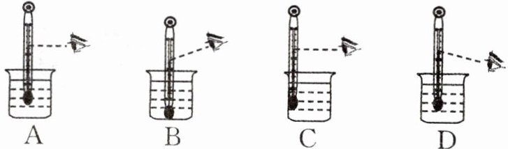 A 解析:A选项中读数时温度计没有离开被测液体,没有接触烧杯底和烧杯壁,并且视线与温度计中液柱的上表面相平,符合温度计的正确使用方法;B选项中温度计的玻璃泡接触到了烧杯底,并且读数时的视线倾斜了;C选项中的读数视线虽然没有倾斜,但温度计的玻璃泡接触了烧杯壁;D选项中读数时视线倾斜了。