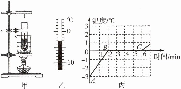 $ ^{\circ}C $。(3) 图丙是小明根据记录的数据绘制的温度随时间变化的图像,由图可知, $ B $ 至 $ C $ 阶段冰所处的状态为