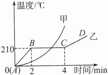 C 解析:甲物质从一开始就熔化,没有固定的熔化温度,即甲没有熔点,所以甲是非晶体;乙物质在熔化过程中有温度不变的过程,即乙有一定的熔点,所以乙是晶体,故A错误。通过分析图像可知,乙有固定的熔点,为210℃,甲没有熔点,故B错误。因为晶体有一定的熔点,在熔化过程中处于固液共存状态,故C正确。乙物质在BC段处于熔化过程,此时温度不变,但吸收热量,故D错误。