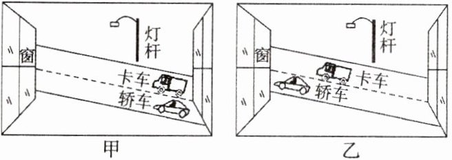 14. 小明家的窗外有条公路。他看到窗外的情景由图甲变为图乙,判断轿车是运动的。他选择的参照物不可能是(