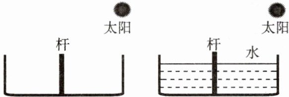 13. 下图是两个并排且深度相同的水池,一个水池有水,另一个水池没有水,在两个水池的中央各竖立着一只长度相同而且比池深略高的标杆。当阳光斜照时就会在池底形成杆的影子,下列说法正确的是(