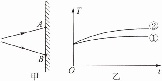 16.(2024·江苏苏州中考)如下图甲所示,A、B 之间是太阳光经三棱镜色散后在屏上得到的彩色光带。将电子温度传感器分别放在 A、B 两点外侧,测得温度 T 随时间 t 变化的图像如图乙所示,则曲线①对应光线的特点是