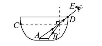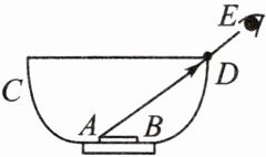 16. 如下图所示,人眼在 E 处通过碗的边缘 D 点刚好能看到空碗底部硬币的左边缘 A 点。现在向碗里缓慢加水,当水面到达 C 处时,人眼仍在 E 处,但能通过 D 点看到硬币的右边缘 B 点。用一条光线表示以上光学现象。(画出水面及法线)