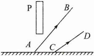 10. 如下图所示,平面镜上方有一竖直挡板 P,AB 和 CD 是挡板左侧的发光点 S 经过平面镜反射后的两条反射光线。请在图上作出发光点 S 及两条入射光线。(保留作图痕迹)