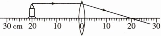 C 解析:已知蜡烛通过凸透镜成倒立、缩小的实像,则物距$u>2f$,像距$2f>v>f$,此时凸透镜成的是倒立、缩小的实像,故B错误。由题图可知,$u=20\ cm$,则透镜的焦距$f$应小于$10\ cm$,小红画的光路图是错误的,故A、D错误,C正确。