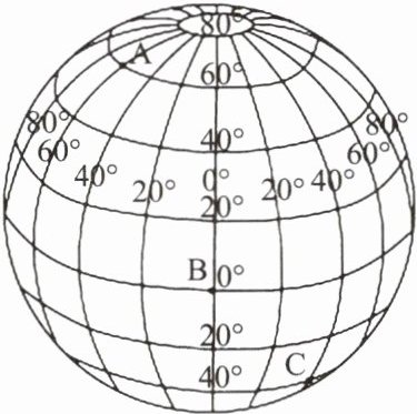 (2)在图中 A、B、C 三地中,位于南、北半球分界线上的是______地,位于东半球的是______地,位于西半球的是______地。