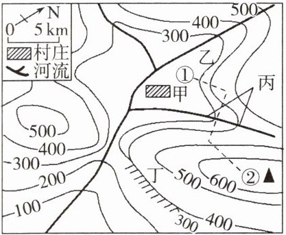 “五一”期间,刘老师来到下图中的甲地,准备按照该地等高线(单位:米)示意图沿着虚线从①处到②处完成一次登山活动。据此回答6~7题。