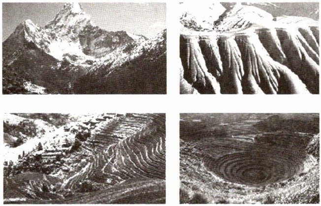 3. 我们学习了五种基本地形类型,除了平原外还有下面四种,你能依次说出它们的名称吗? ( )
