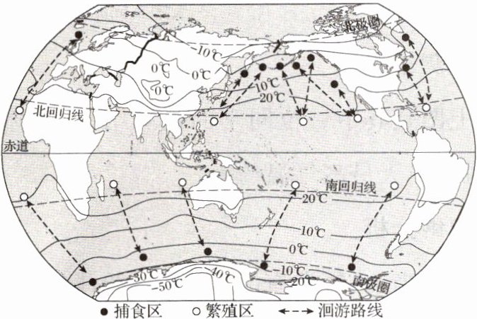 (2021·潍坊中考)大翅鲸在全球范围内都有分布,每一个种群都有特定的捕食区、繁殖区和洄游路线。夏季到冷水海域捕食,冬季到温暖海域繁殖。下图为全球大翅鲸分布及洄游路线示意图。读图,回答19~20题。